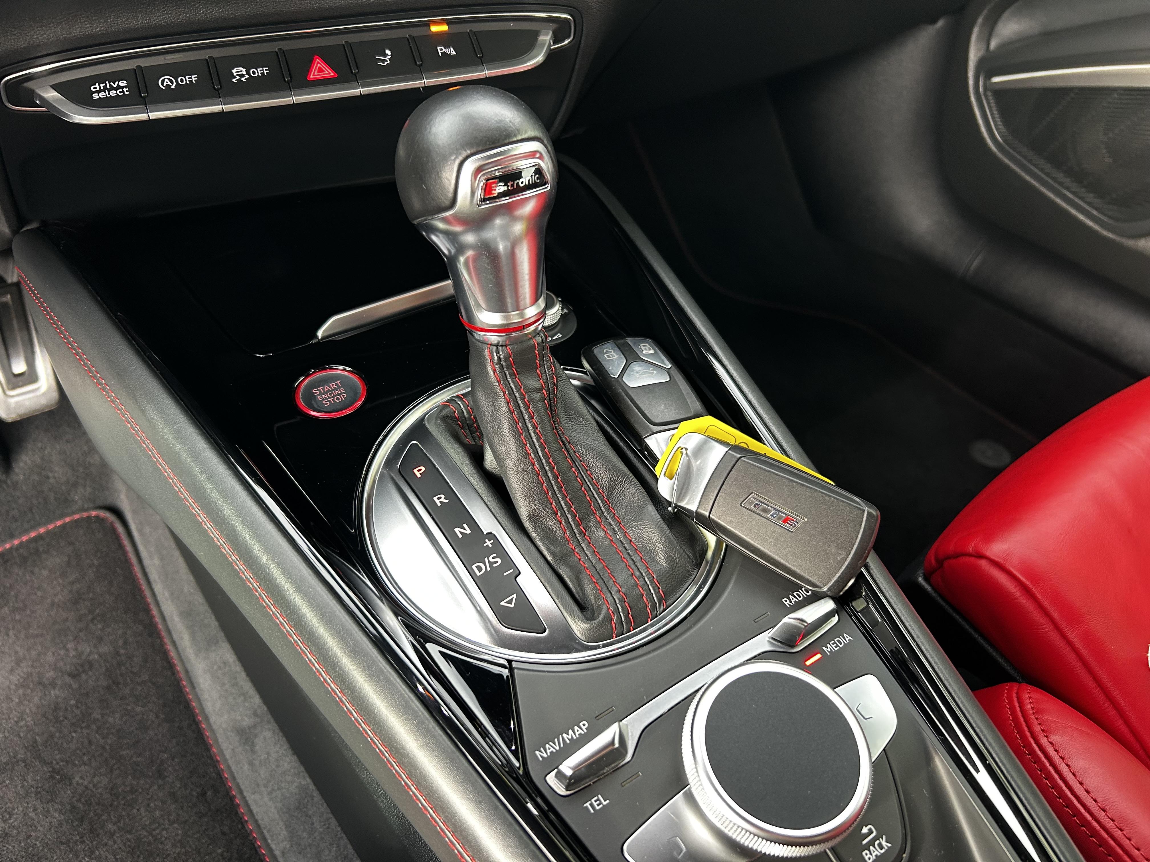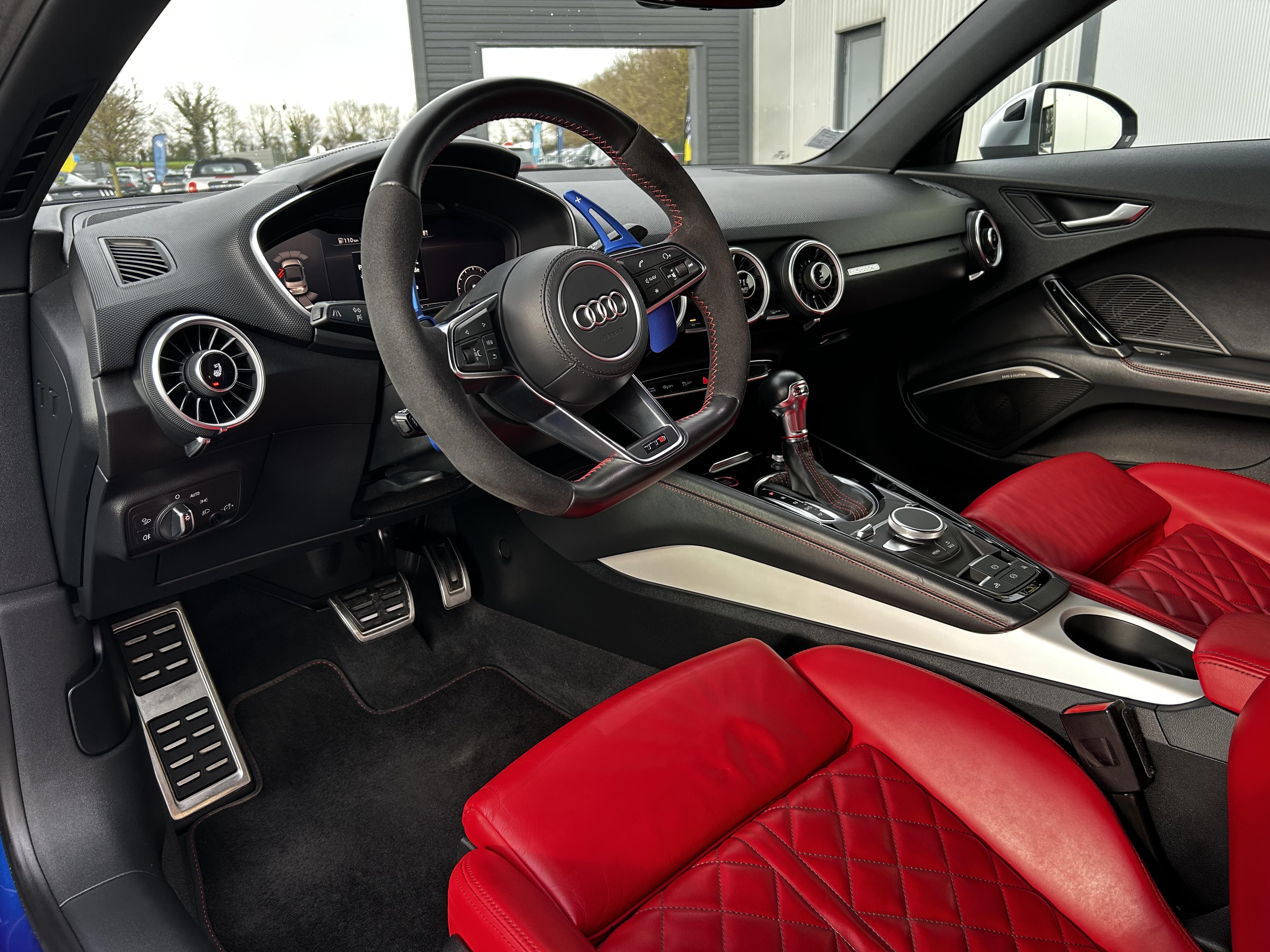 • Volant Sport TTS contour en cuir multifonctions plus style 3 branches aplati en bas avec emblème TTS surpiqûres spécifiques S et palettes de changement de vitesses avec S Tronic